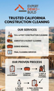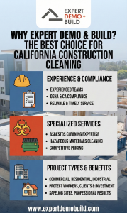 At Expert Demo & Build, we provide professional construction site cleaning, asbestos cleaning, and hazardous materials cleaning throughout California. This guide explains everything general contractors need to know to maintain safe and compliant construction sites.